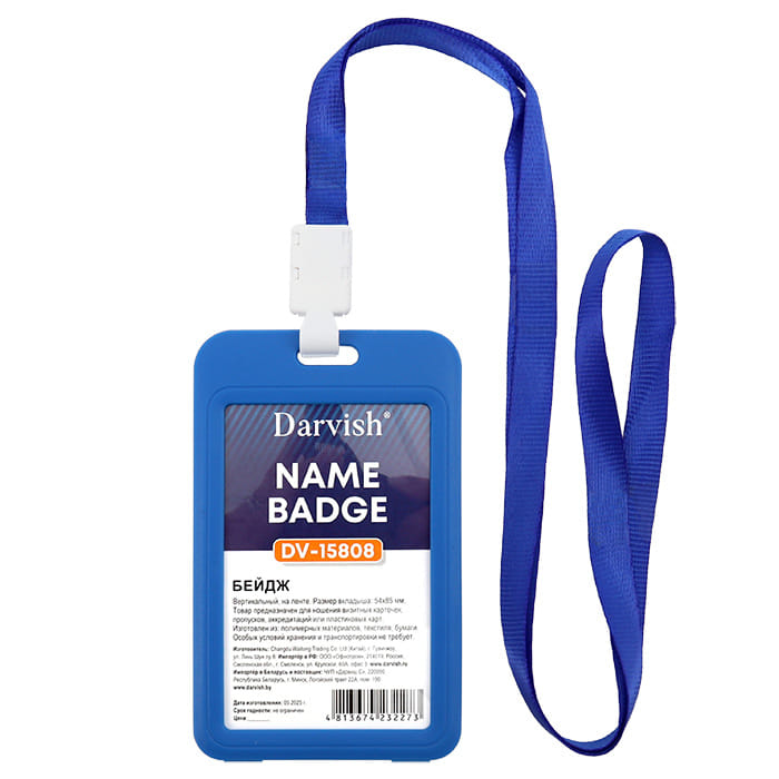 Бейдж на ленте вертикальный. Размер вкладыша: 54*85 мм. Предназначен для ношения визитных карточек, пропусков, аккредитаций или пластиковых карт. Длина ленты: 42,5 см, синий цвет. Упаковка 12шт ассорти - пакет 18*17*1см