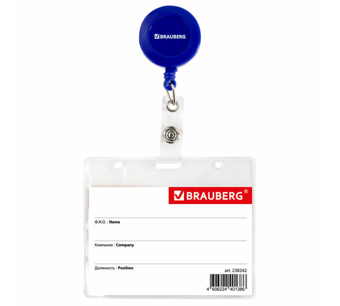 Горизонтальный бейдж BRAUBERG на держателе-рулетке используется для размещения именных карточек, пропусков, пластиковых карт.