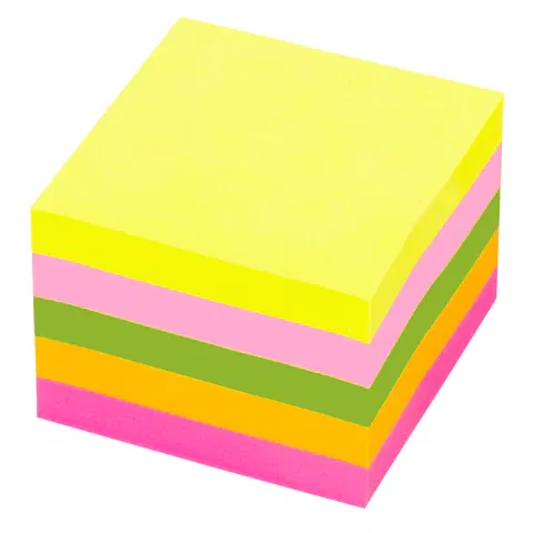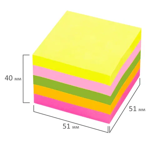 Стикеры 5 неоновых цветов (желтый, розовый, зелёный, оранжевый, малиновый) в форме куба 51х51 мм состоят из 400 листов. Плотность бумаги составляет 75 г/м2. Клейкий слой - 22 Н/м. Легко клеятся к любой поверхности. Не оставляют следов. Упакованы в полиэтиленовую пленку.