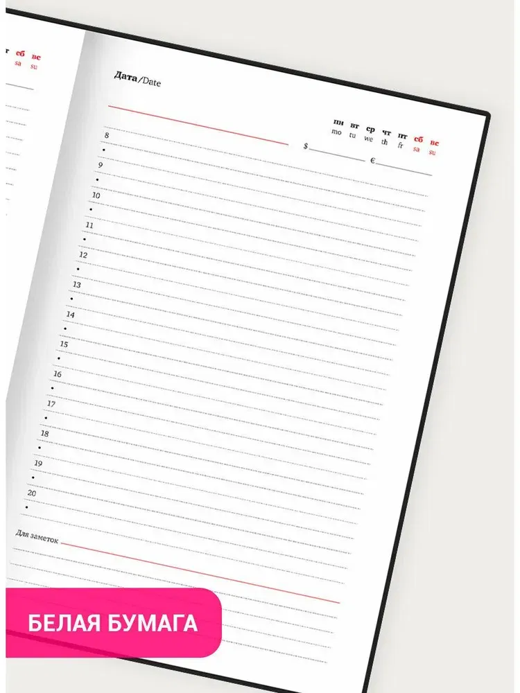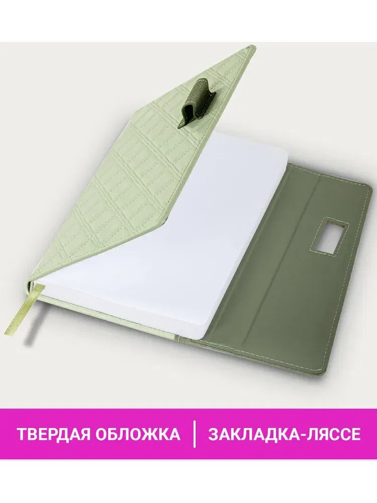Внутренний блок включает 160 листов белой бумаги плотностью 70 г/м2. Каждая страница имеет перфорированный угол. Благодаря стандартному формату А5 (145х215 мм) ежедневник удобно использовать как в офисе, так и на выездных деловых встречах.