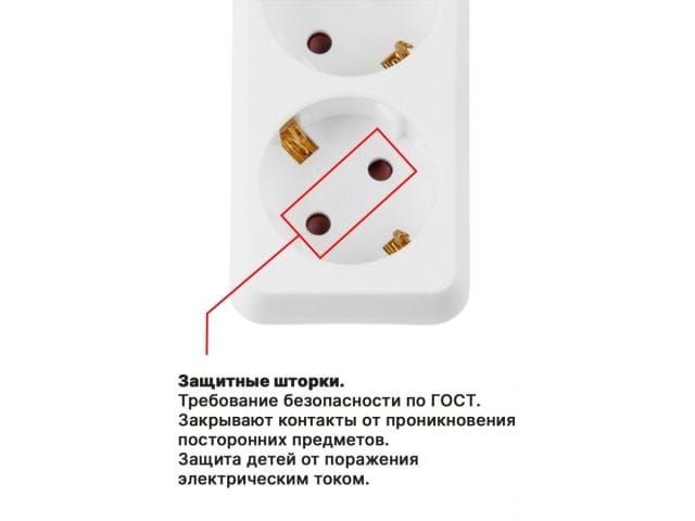 Защитные шторки открываются нажатием только на две одновременно, что обеспечивает надежную защиту от случайного прикосновения к токоведущим частям (защита детей).