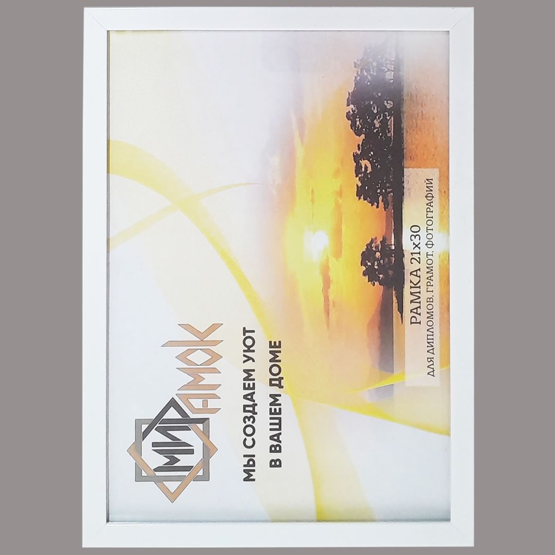 Рамка пластиковая со стеклом, 21×30, белая, для фотографий А4 формата, крепится на стену.