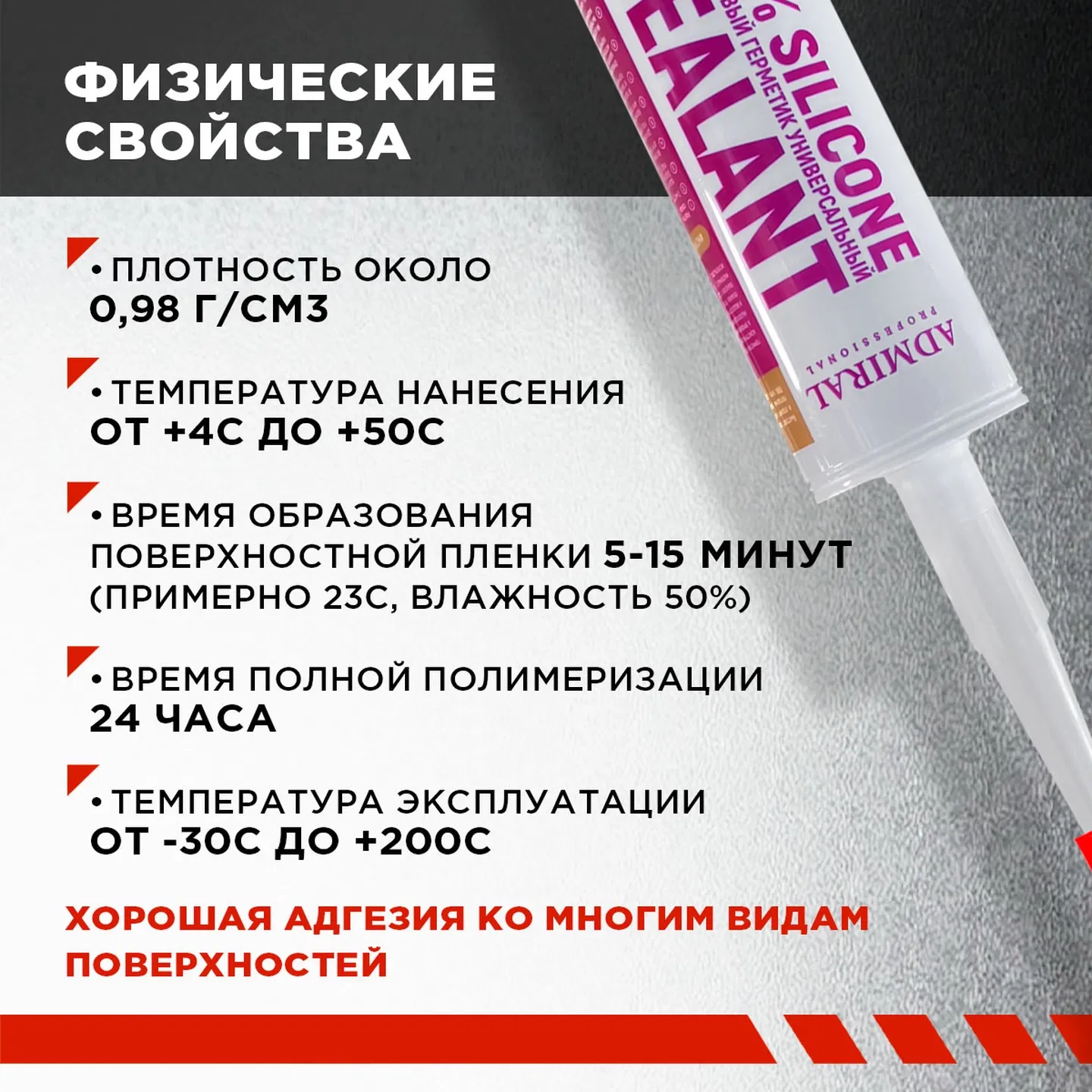 Высококачественный универсальный силиконовый герметик Admiral Professional с противогрибковой добавкой представляет собой однокомпонентный уксусно-силиконовый герметик, отверждаемый при комнатной температуре. Предназначен для уплотнения, соединения и защиты непористых поверхностей от проникновения воздуха и влаги; для герметизации оконных рам, дверных коробок, кабельных каналов; герметизации стыков при монтаже сантехнического оборудования, систем кондиционирования воздуха; защиты полиуретановой монтажной пены от УФ-лучей.
