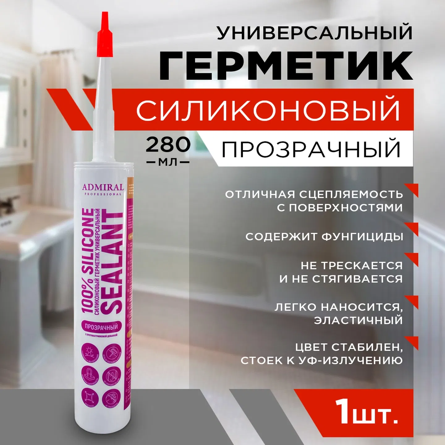 Герметик силикон. Admiral Professional, универс. с противогрибковой добавк 280 мл,ПРОЗРАЧНЫЙ,Росиия АДМИРАЛ Цена с НДС