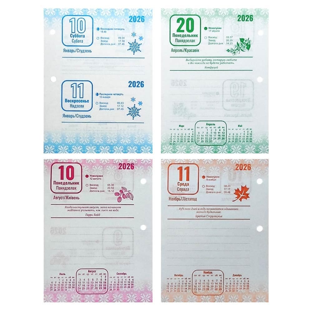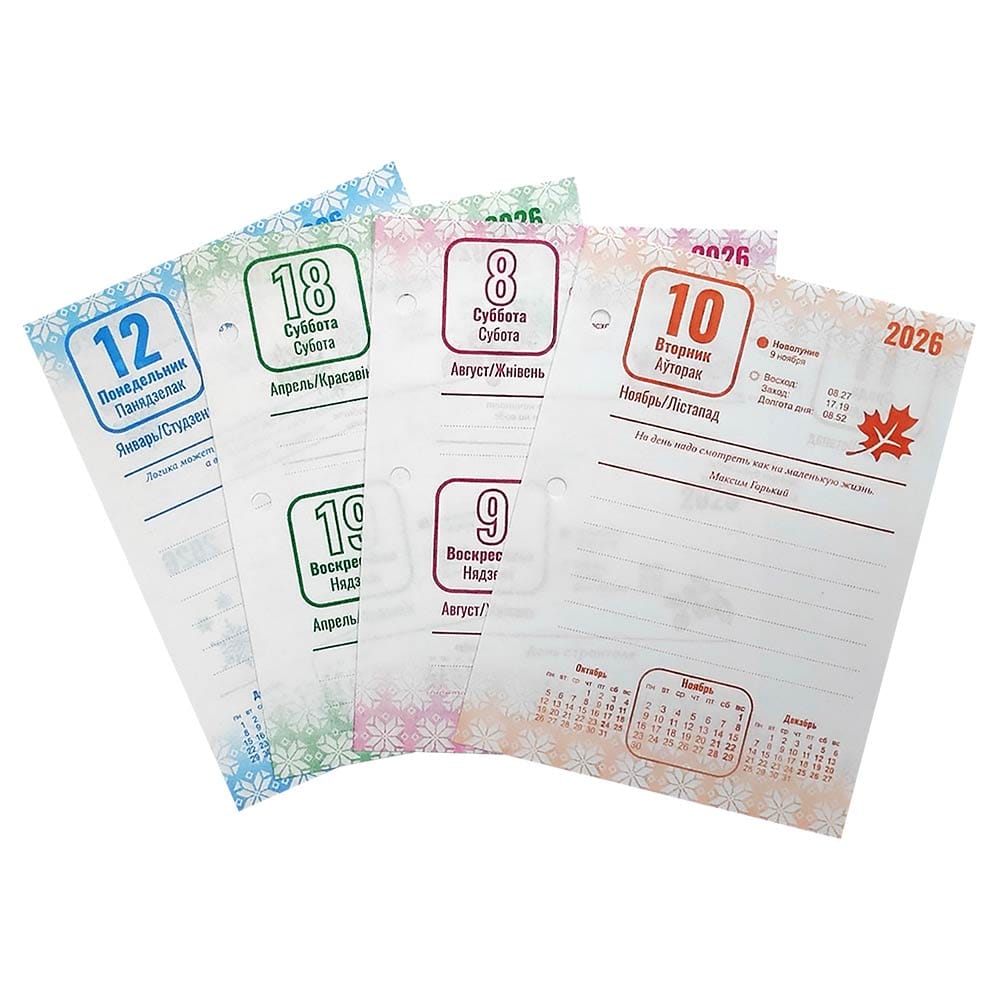 Настольный перекидной календарь на 2026 год из офсетной бумаги формата 105х140 мм на кольцевом механизме. Отверстия сбоку позволяют закрепить блок на подставке для удобного перелистывания без отрыва страниц.