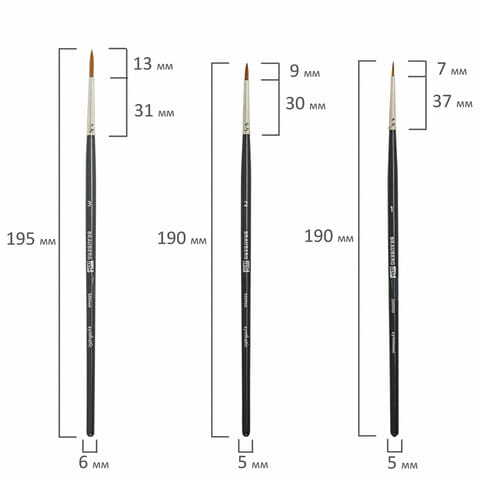 Кисти изготовлены с применением синтетики. Отличаются универсальностью в использовании, обусловленной упругостью ворса и прекрасными впитывающими свойствами пучка. Длинная ручка из древесины покрыта лаком, что защищает ее от воздействия красок и влаги. Форма пучка - круглая № 1, 2, 3; плоская № 6, 12. Номер кисти соответствует реальной ширине пучка в миллиметрах. Упаковка - пакет с европодвесом и картонной подложкой.