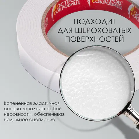Двухсторонняя клейкая лента на вспененной основе ОСТРОВ СОКРОВИЩ применяется для оформительских и декоративных работ, крепления мелких элементов, составления коллажей и многого другого.
