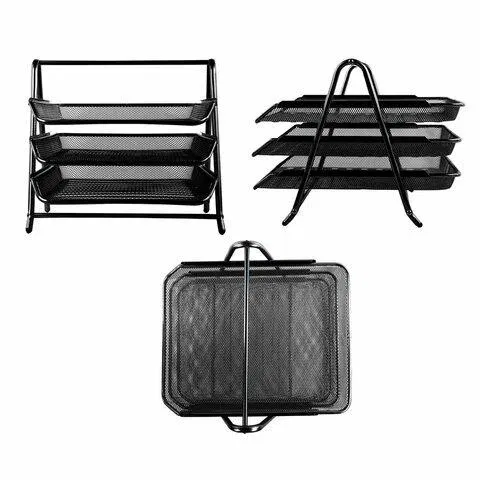 Лотки могут использоваться отдельно от опоры. Выдвижной механизм обеспечивает легкий доступ к содержимому лотков. Изготовлен из высококачественной прочной металлической сетки. Выполнен в классическом черном цвете. Размер лотка - 30х273х355 мм. Высота конструкции в собранном виде - 267 мм. Упакован в индивидуальную коробку, на которой имеется схема сборки.