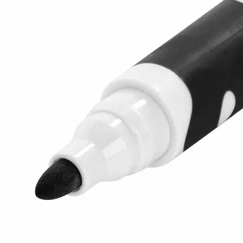 Маркер для доски черного цвета обладает круглым пластиковым корпусом диаметром 17 мм. Корпус оснащен удобной прорезиненной зоной захвата для более удобного использования. Наконечник круглой формы обеспечивает толщину линии письма 5 мм, что позволяет писать крупным шрифтом, который будет хорошо виден. Основа чернил - спиртовая. Чернила быстро высыхают и не оставляют разводов, легко стираются сухой губкой. Изделие не перезаправляется. Цвет колпачка и прорезиненной вставки соответствует цвету чернил.