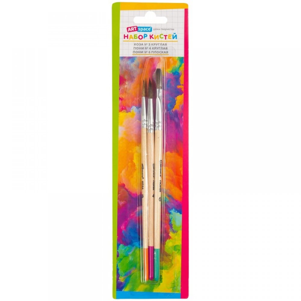Набор кистей 3 шт, ART SPACE (коза №3 круглая, пони №4 круглая, пони №6 плоская), Китай ARTSPACE Цена с НДС