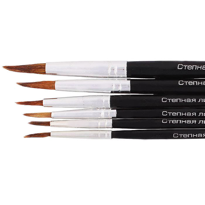 Тип: набор кистей Количество кистей в наборе: 6 Форма кисти: круглая Кисть №: 1, 2, 3, 4, 5, 6 Материал ворса кисти: белка Материал ручки: дерево Цвет: бежевый