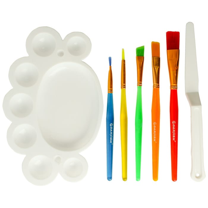 Набор кистей художественных (5 штук) + мастихин + палитра. Предназначен для художественных и декоративно-оформительных работ. Кисти изготовлены из синтетического ворса, материал ручки : пластмасса, металл. Подходят для работы с любыми видами красок, хорошо держит форму. Упаковка - блистер 12,5*23*2,5см.