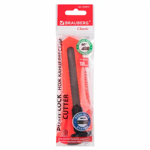 Инструмент прекрасно лежит в руке за счет специфической формы корпуса и рифленой поверхности. Его можно удобно зафиксировать, не беспокоясь о том, что нож соскользнет и отрежет лишнее или поранит кожу. Для того, чтобы лезвие не меняло свое положение, предусмотрен специальный фиксатор. С его помощью режущую часть можно выдвинуть настолько, насколько это необходимо. Лезвия подлежат замене, запасной комплект приобретается отдельно. Заменить режущую часть просто: достаточно снять верхнюю заглушку и вытащить затупившийся или поломанный элемент. Если кончик лезвия затупился, его можно отломить по специальной контрольной линии. Сделать это удастся даже не вынимая режущую поверхность из ножен, аккуратно надавив на край выдвинутого лезвия. Отличается повышенной прочностью, удобством в использовании и долговечностью. Широкое лезвие в 18 мм позволяет работать с довольно плотными материалами, например, картоном, пластиком или тонкой древесиной. Большие объемы ткани, бумаги, целлофана и других материалов тоже прекрасно поддаются воздействию канцелярского ножа BRAUBERG «Classic». Доступны инструменты в красном, желтом и зеленом цветовых решениях (поставляются без возможности выбора). Само изделие поставляется в упаковке с европодвесом.