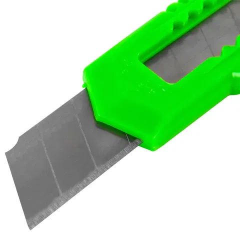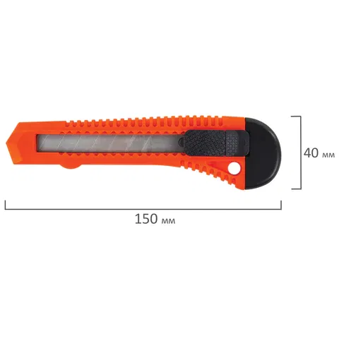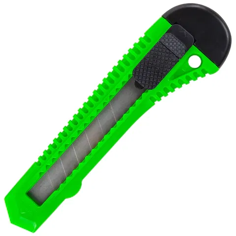 Ширина лезвия - 18 мм, что позволяет использовать его для более плотных и тонких материалов, нежели аналогичный инструмент меньшего размера. Для того, чтобы лезвие не задвигалось, имеется надежный фиксатор. Хорошая заточка позволяет работать даже с самыми капризными и сложными материалами. Инструмент может использоваться при отделочных работах или в домашнем хозяйстве, однако основное место его применения – офис. Затупившийся кончик всегда можно аккуратно отделить и вернуть ножу былую остроту. Запасные лезвия необходимо приобретать отдельно. Имеется отверстие для подвеса. Поставляется в нескольких вариантах цвета (без возможности выбора).