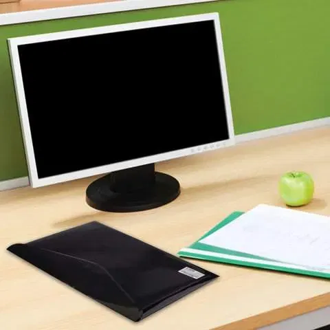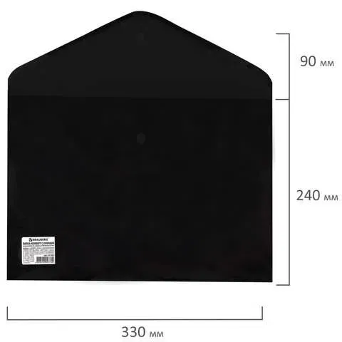 Папка-конверт с гладкой фактурой формата А4 изготовлена из плотного пластика черного цвета толщиной 200 мкм. Закрывается на защелку-кнопку, что делает удобным частое использование и обеспечивает быстрый доступ к ее содержимому. Папка способна вместить до 100 листов стандартной плотности.