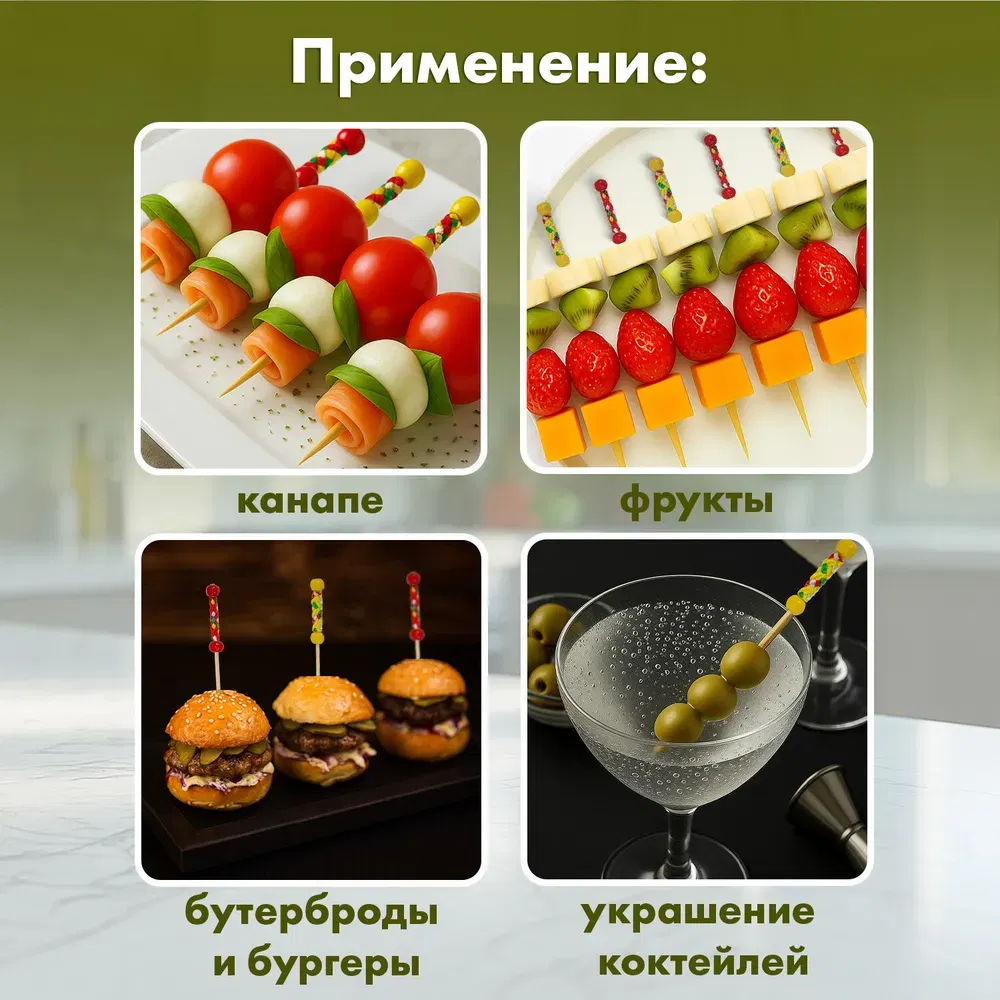 Бамбуковые пики для канапе подходят для подачи закусок на праздничных мероприятиях, банкетах и фуршетах. Они используются для создания канапе, мини-бутербродов, рулетов, украшения блюд и сервировки ягод и фруктов.