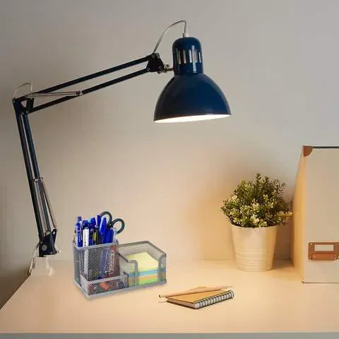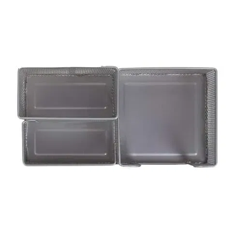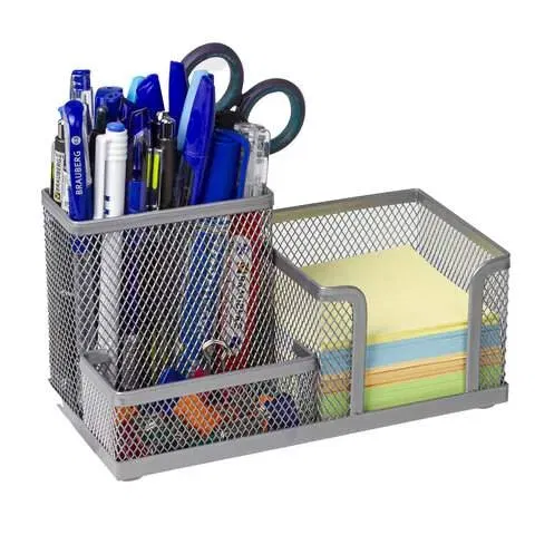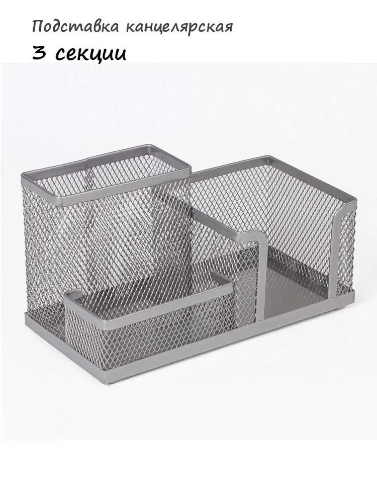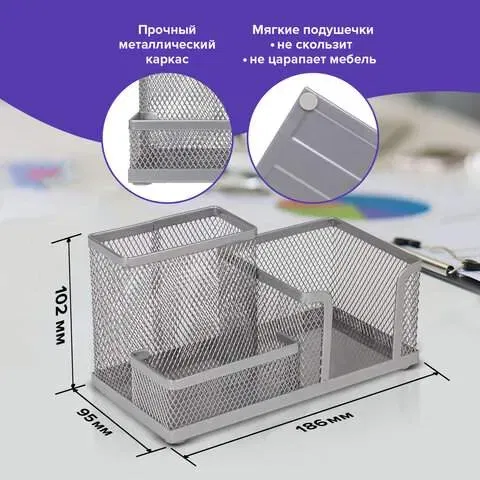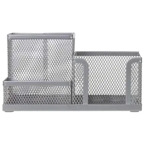 Изготовлена из металлической сетки. Имеет размеры 102х186х95 мм. Состоит из 3 отделений: одного – для бумажного блока размером 90х90 мм и двух – для пишущих принадлежностей и канцелярских мелочей. Мягкие подушечки на дне предотвращают скольжение и порчу мебели. Поставляется без канцелярского наполнения.