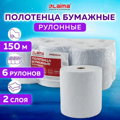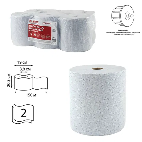 Мягкие, с хорошей впитываемостью. Обеспечивают экономичный расход. Изготовлены из 100% целлюлозы. Имеют два слоя, с тиснением. Длина намотки - 150 м. Применяются в диспенсерах системы H1. 6 рулонов в спайке.