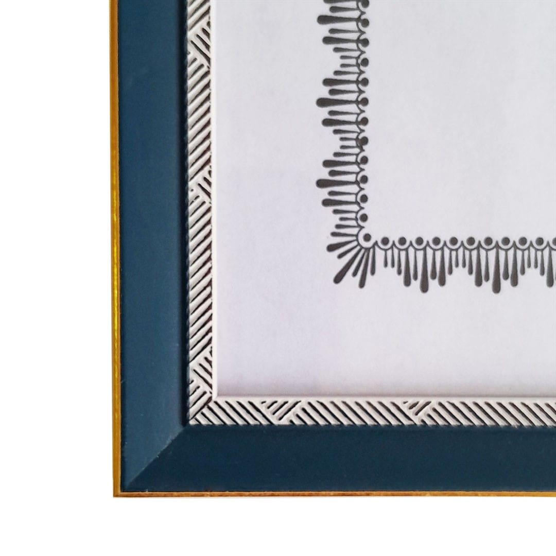 Пластиковая рамка со стеклом, темно-синяя с внешней золотой окантовкой и внутренним орнаментов, для фотографий А4 формата, крепится только на стену.
