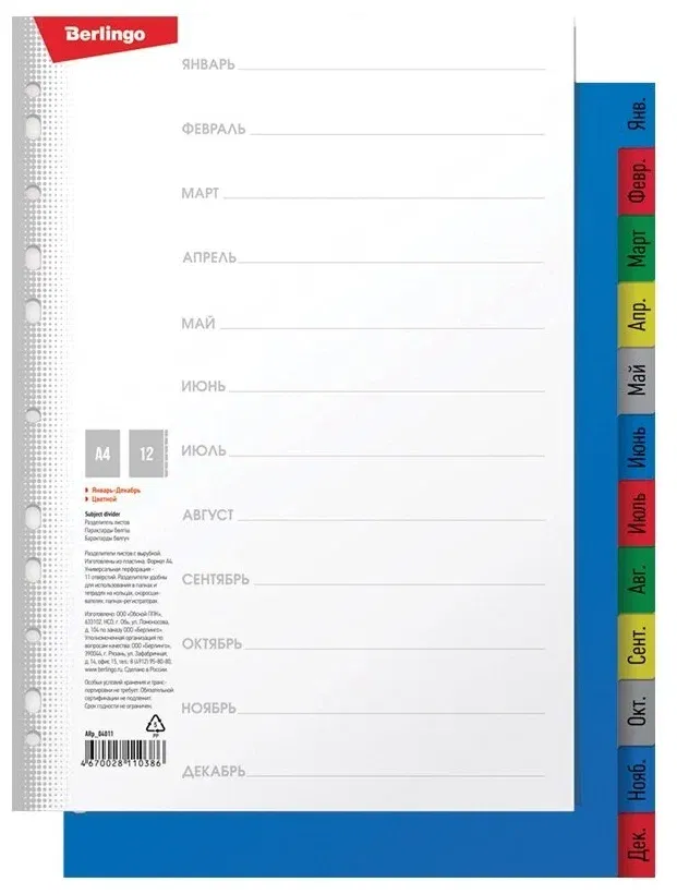 Разделитель 12 месяцев янв-дек., цветной, пластик., BERLINGO Цена с НДС