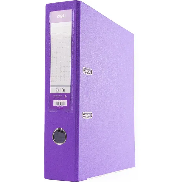 Папка-регистратор Deli из картона с ПВХ-покрытием и c металлическим уголком. Имеет на торце этикетку для подписи, круглое отверстие для захвата, на лицевой поверхности находятся прорези-замки для замыкания папки в закрытом состоянии. Высота регистратора 316 мм.
