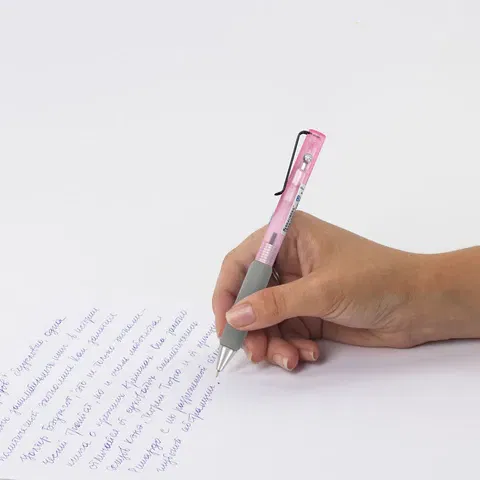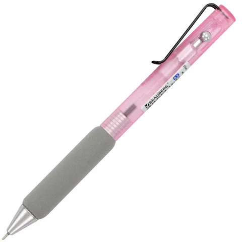 Тонированный корпус ручки представлен в двух цветах: розовый и серый (ассорти без возможности выбора). Необычный и современный дизайн достигается за счет металлического клипа и увеличенного в размерах мягкого грипа. Шариковый игольчатый узел диаметром 0,5 мм позволяет создать линию письма 0,35 мм.
