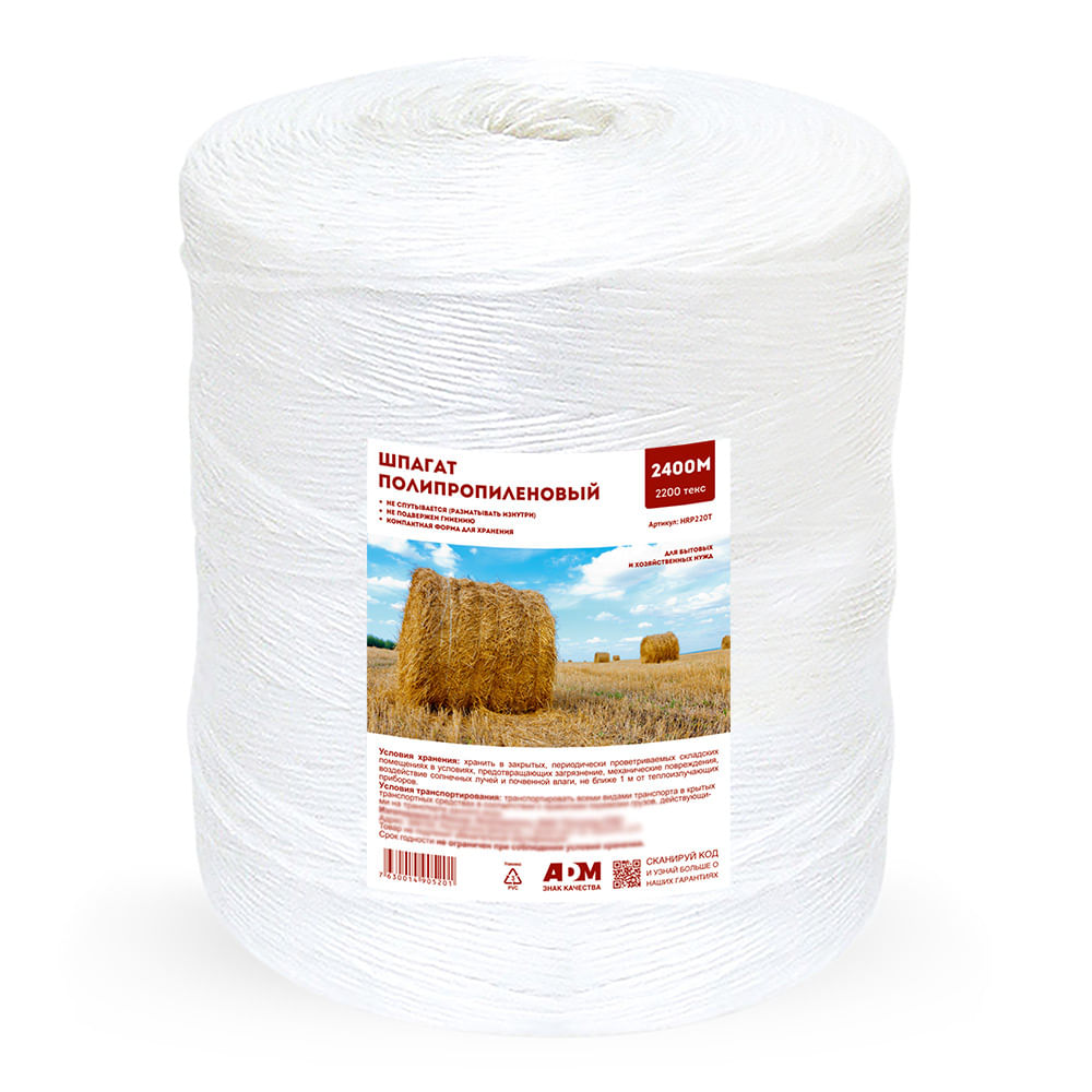 Прочный полипропиленовый шпагат, устойчив к трению, влиянию растворителей, щелочей и кислот, высокой влажности, кипящей воде, не подвержена гниению. Подходит для формирования тюков и рулонов при заготовке сена и соломы.