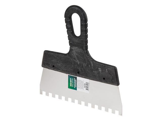 Зубчатый шпатель представляет собой вспомогательный инструмент для ручной укладки плитки. Металлические зубья предназначены для равномерного распределения клея или другой строительной смеси по поверхности укладываемого элемента. Толщину слоя при этом можно варьировать, изменяя степень нажатия на шпатель и угол наклона зубьев. Удобная ручка из пластика имеет отверстие для хранения шпателя в подвешенном положении.