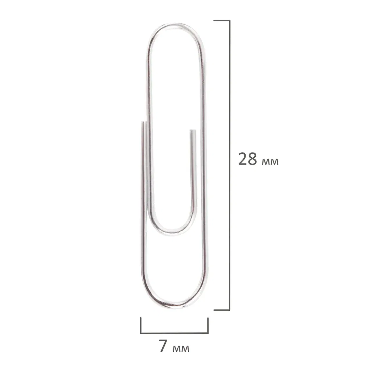 Скрепки изготовлены из стали, имеют классическую овальную форму. Длина скрепки составляет 28 мм. Не окисляются и не повреждают документы. 100 штук в картонной коробке.