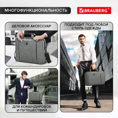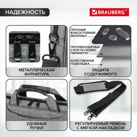 Многофункциональная сумка BRAUBERG OFFICE с отделением для ноутбука с диагональю экрана до 17,3". Надежный аксессуар с металлической фурнитурой и прочными материалами защитит устройство от внешних воздействий.