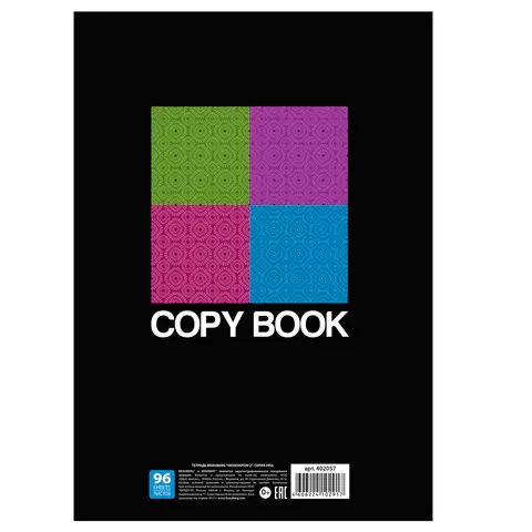 Внутренний блок содержит 96 листов офсетной бумаги плотностью 65 г/м2. Обложка изготовлена из мелованного картона. Линовка – клетка. Скрепка надежно скрепляет листы между собой. Белизна – 100%. Формат А4.