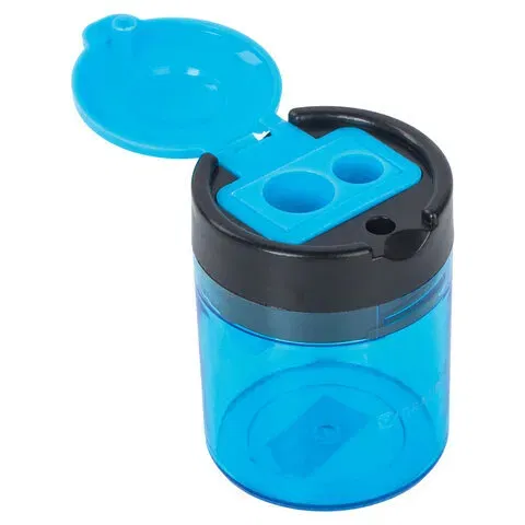 Корпус цилиндрической формы выполнен из пластика. Точилка оснащена двумя отверстиями для заточки карандашей разного диаметра и крышкой для закрытия отверстий. Острое стальное лезвие обеспечивает быструю и легкую заточку. Карандаш затачивается аккуратно, а опилки остаются в специальном контейнере. Размер: 56х39х39 мм.