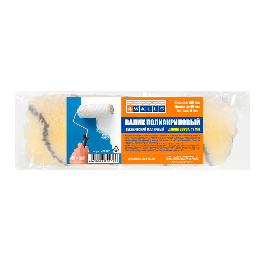 Валик малярный полиакриловый 11 мм, зебра, ш. 180 мм, Master, с ручкой 4Walls Цена с НДС за 1 штуку