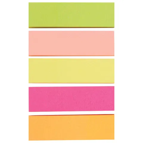 Набор бумажных закладок 5 неоновых цветов размером 50х14 мм состоит из 250 листов, по 50 закладок каждого цвета. Клейкий слой - 22 Н/м. Легко клеятся к любой поверхности и не оставляют следов. Материал закладок позволяет делать надписи ручкой и карандашом. Поставляются в полиэтиленовом пакете с европодвесом.