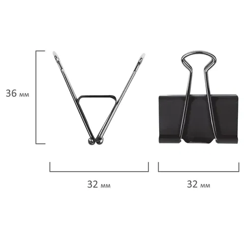 Изготовлены из стали с черным покрытием. Позволяют скреплять до 140 листов. Не деформируют бумагу. Ширина зажима - 32 мм. Поставляются по 12 штук в картонной коробке.