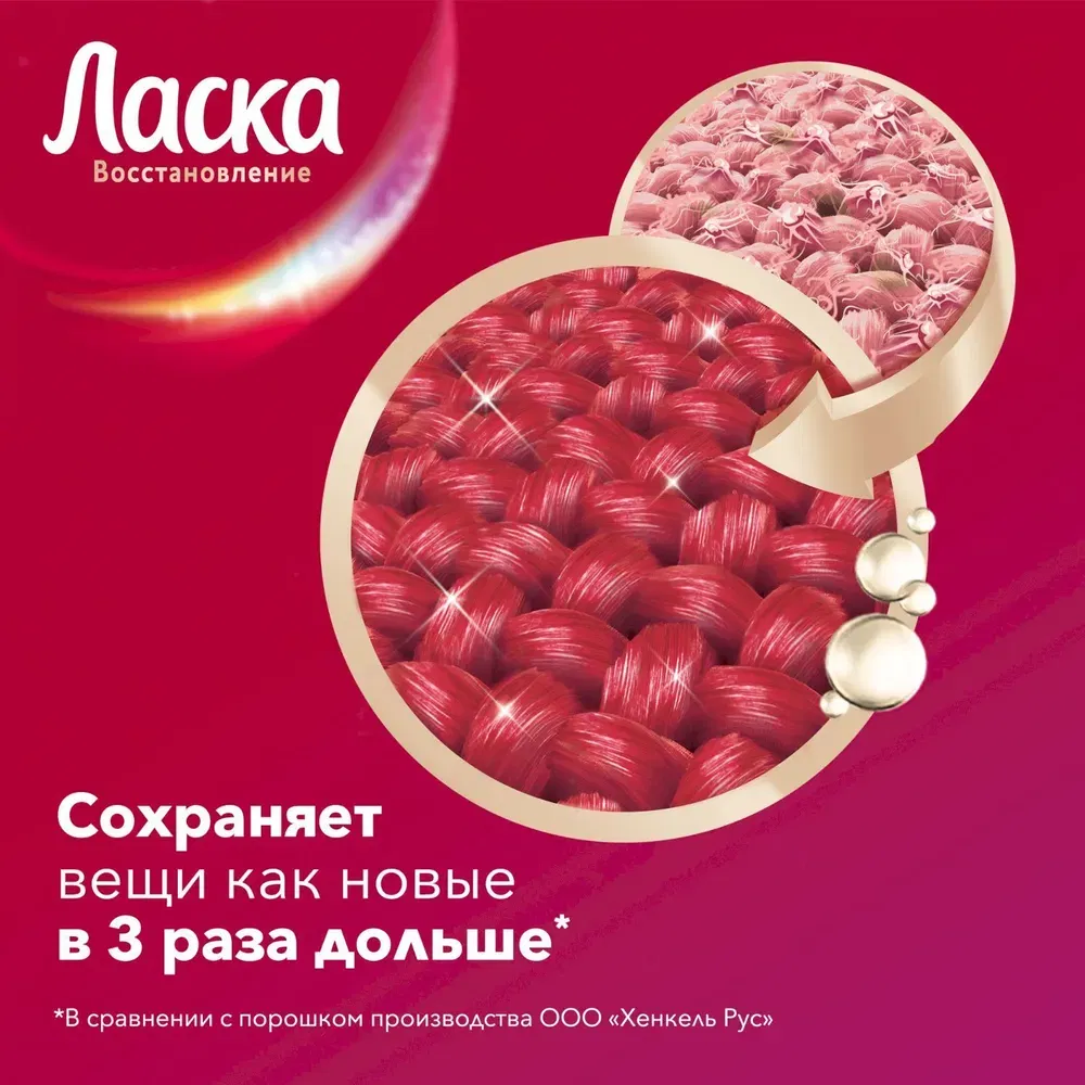 Гель для стирки Ласка Восстановление COLOR для цветного белья Жидкий порошок Ласка Восстановление COLOR для цветного эффективно и бережно отстирывает загрязнения на одежде, восстанавливая яркость цвета и сохраняя прочность волокон ткани. В отличие от обычного стирального порошка, Ласка содержит цветозащитные ингредиенты, которые поддерживают стойкость цвета одежды. Активные компоненты способствуют уменьшению количества катышков на ткани. Формула содержит более 90% ингредиентов натурального происхождения. ПРЕИМУЩЕСТВА ГЕЛЯ ДЛЯ СТИРКИ ЛАСКА: - Бережно и эффективно отстирывает загрязнения. - Восстанавливает и защищает яркость цвета. - Сохраняет форму ткани и препятствует появлению катышков. - Не оставляет разводов. Гель Laska удобен в использовании: дозируйте жидкое средство согласно инструкции, заливайте его в отделение для стирального порошка или добавьте мерный колпачок со средством в барабан стиральной машины. Цвет геля может варьироваться от молочного до светло-розового. Изготовитель: ООО "Хенкель Рус"(107045), 107045, г. Москва, Колокольников пер., д. 11. Россия/ООО «ЛАБ Индастриз», 107045, Россия, г. Москва, Колокольников пер., д. 11